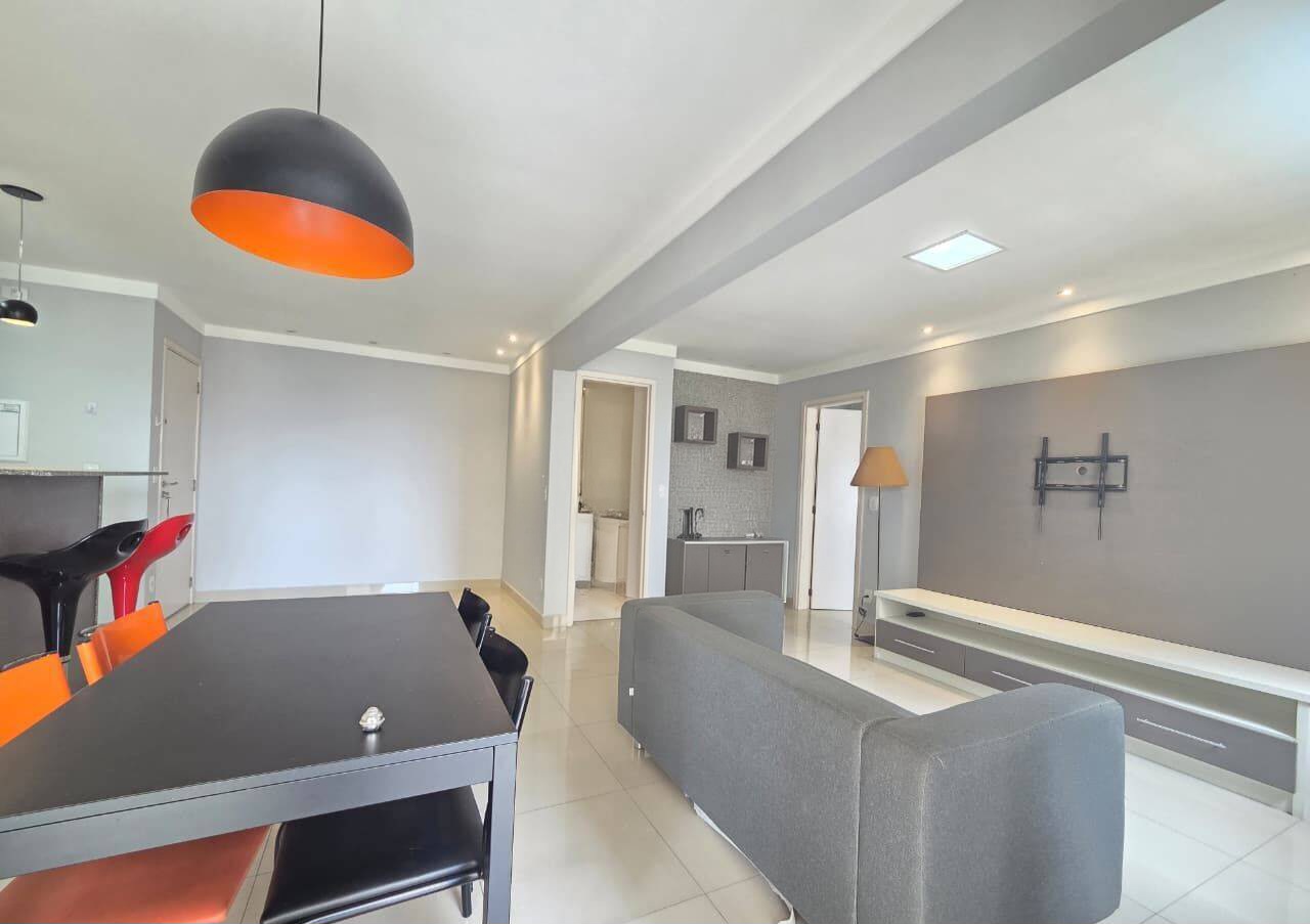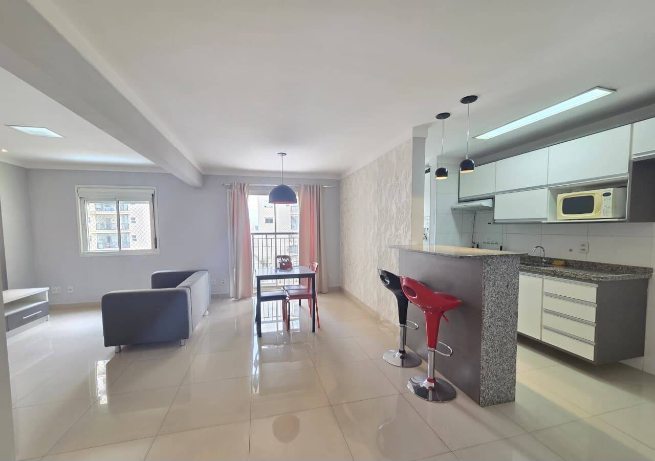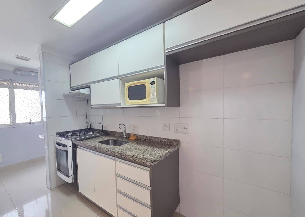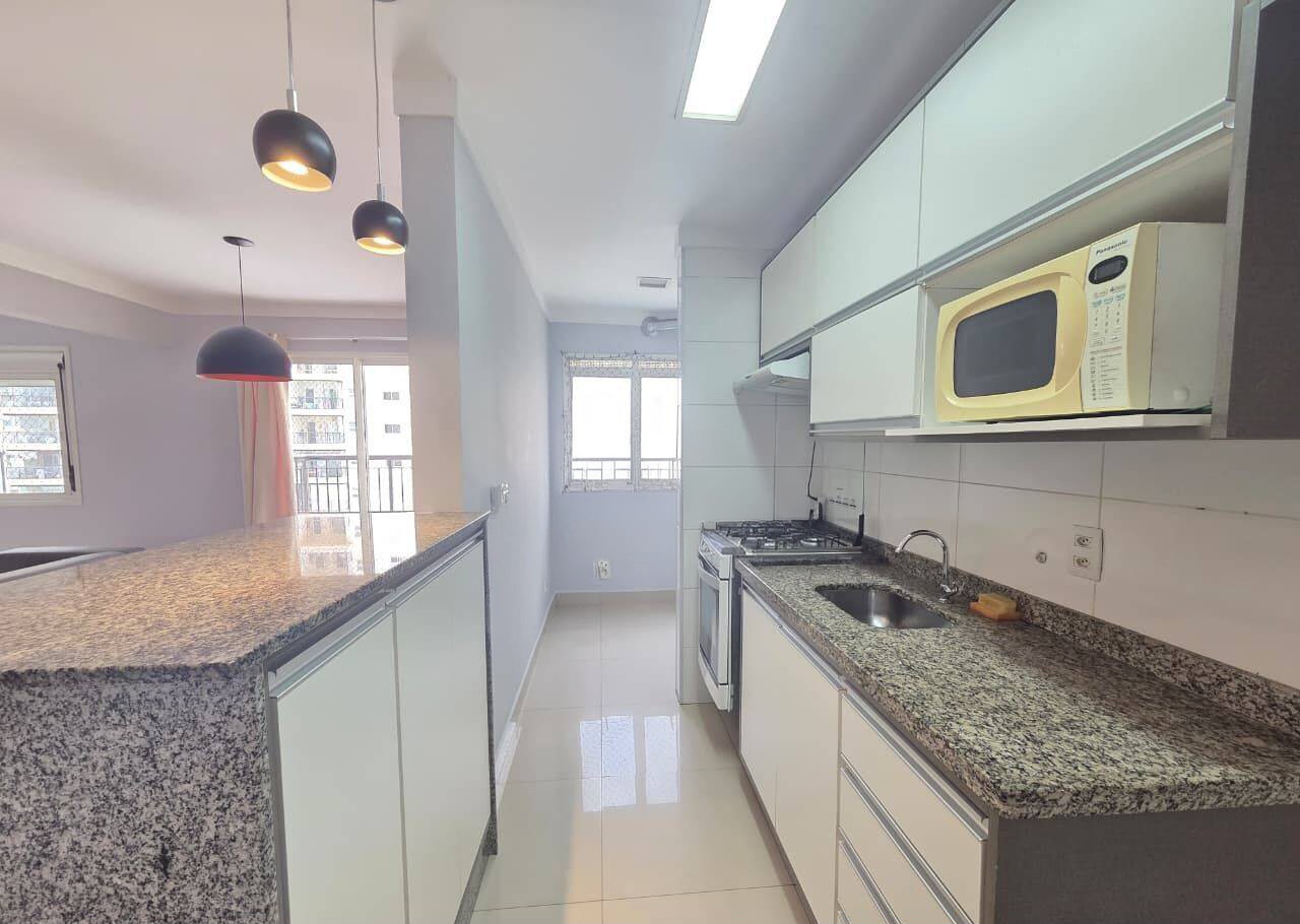 O imóvel possui ambientes integrados, com sala para dois ambientes, ótima iluminação natural e ventilação. A cozinha em estilo americano é funcional e conta com armários planejados, integrada à área de serviço. A varanda oferece vista para o condomínio, proporcionando um ambiente agradável para o dia a dia.