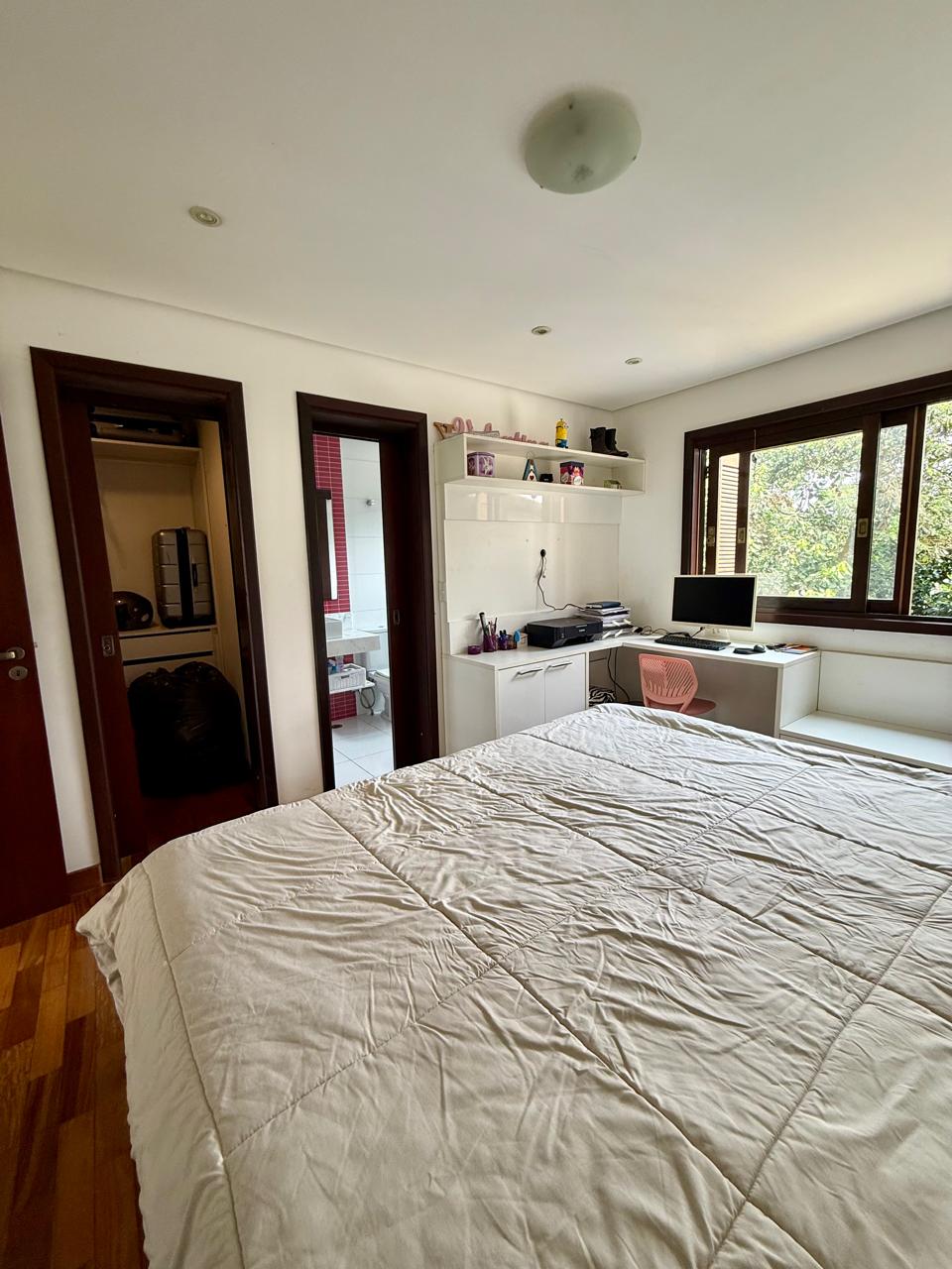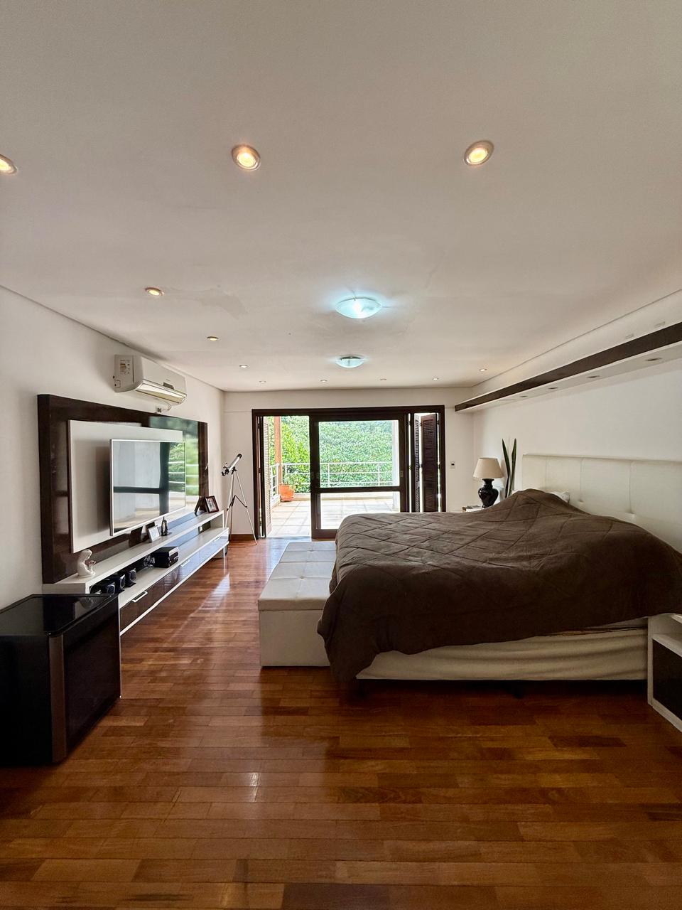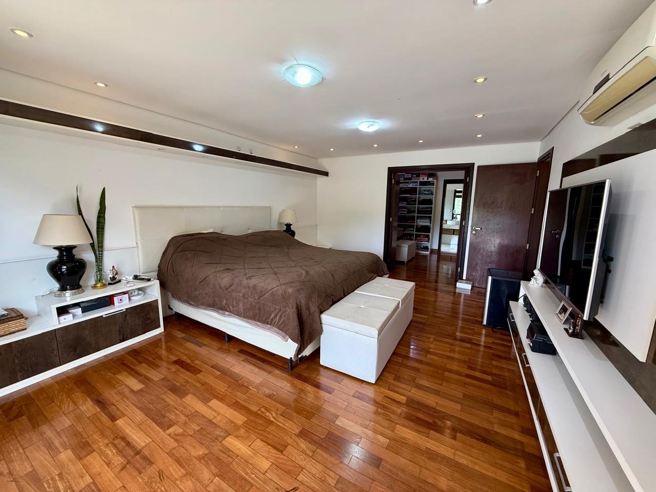 Casa com 4 suítes sendo 1 no térreo e 01 suíte master com closet, móveis planejados, banheira, chuveiro duplo e terraço individualizado; mais 02 suítes com closet e móveis planejados; todas possuem ar-condicionado.