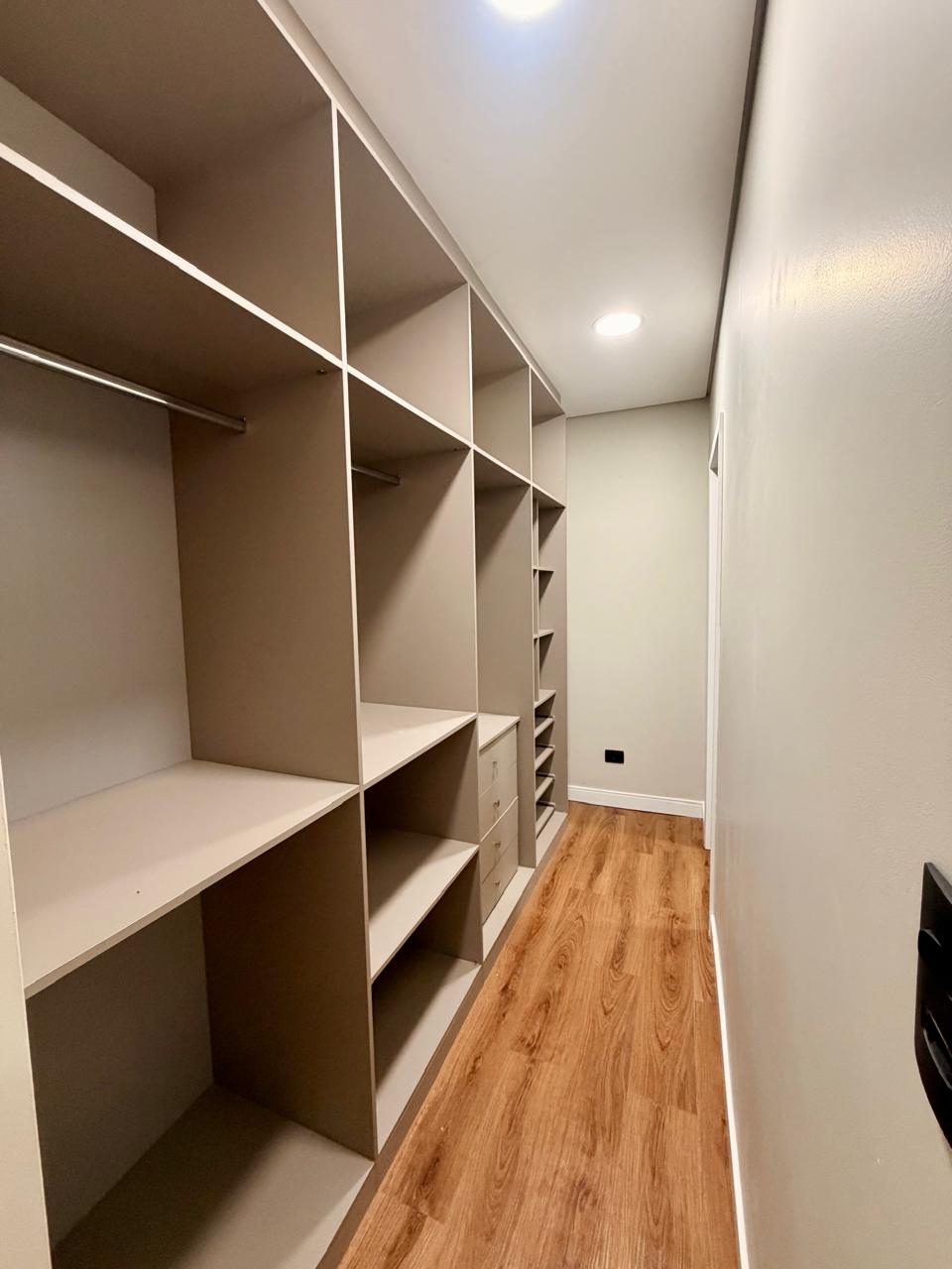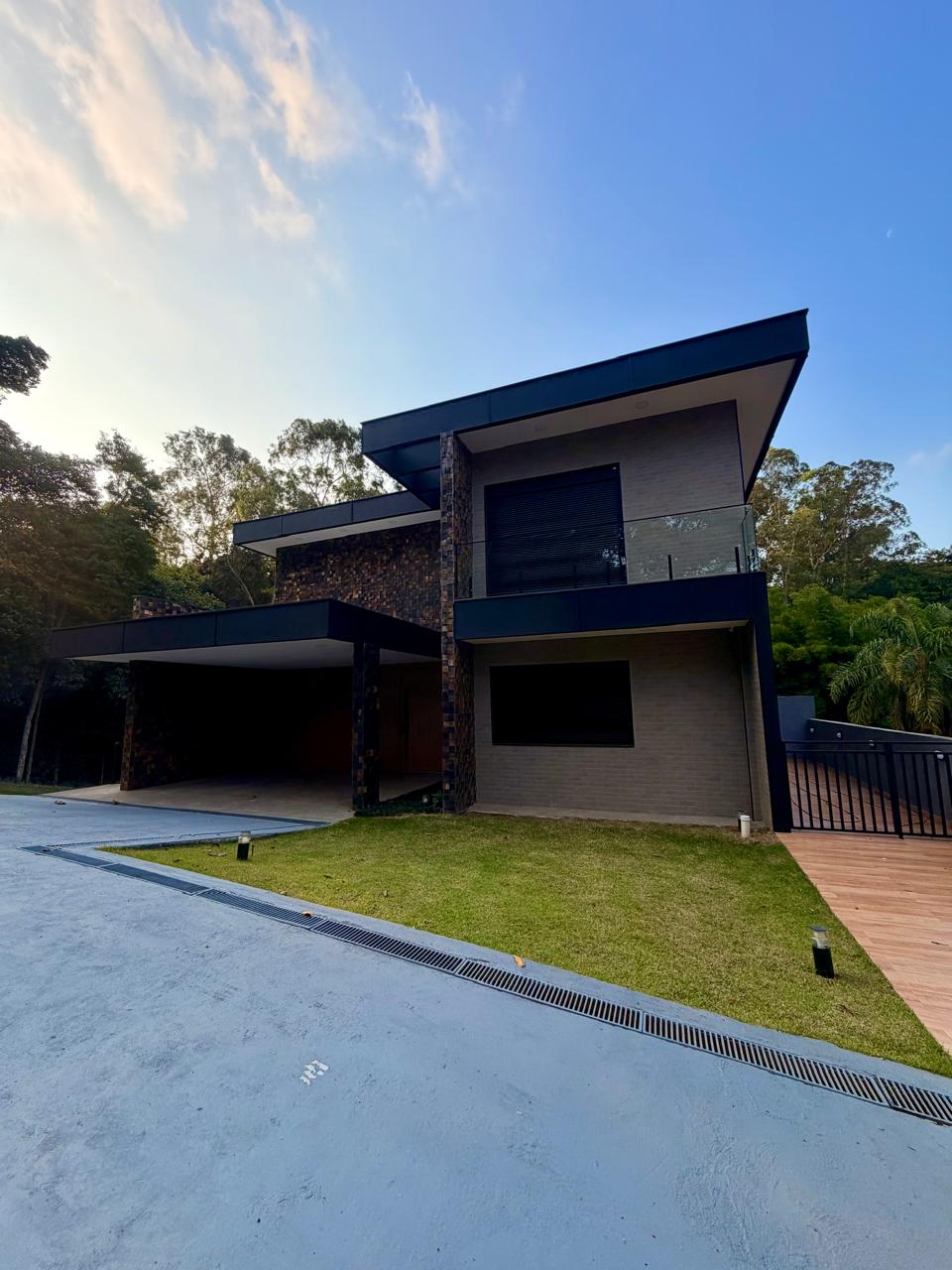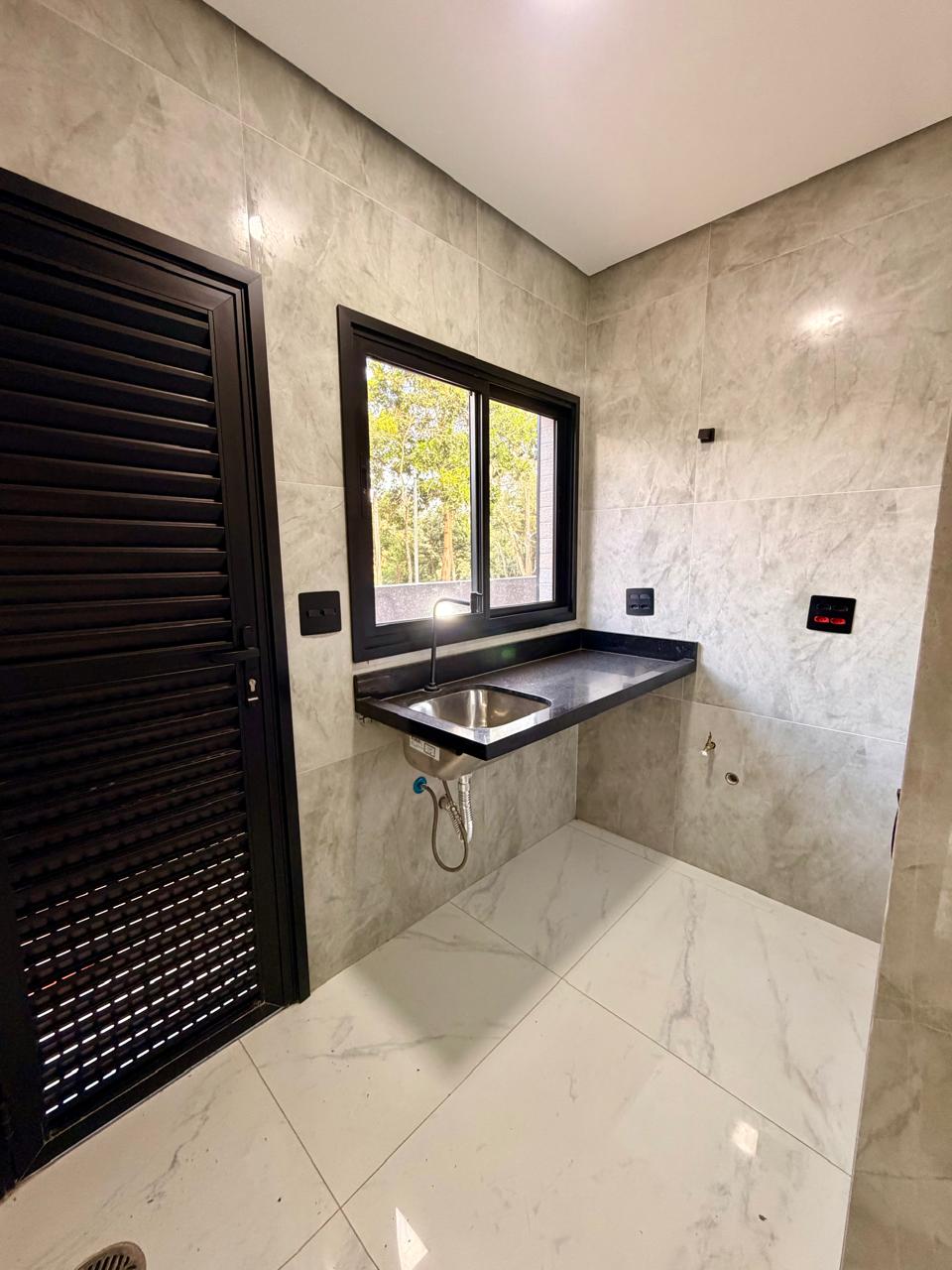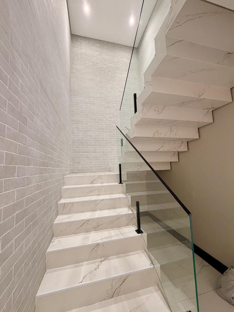 A arquitetura prioriza o conforto térmico e a iluminação, com três suítes avarandadas que convidam ao descanso. A versatilidade é um pilar deste projeto, contando com um escritório no térreo que pode facilmente ser transformado em suíte de hóspedes, atendendo a diferentes configurações familiares. A cozinha, ponto central da casa, já conta com marcenaria sob medida e cooktop instalado, integrada à despensa e área social.