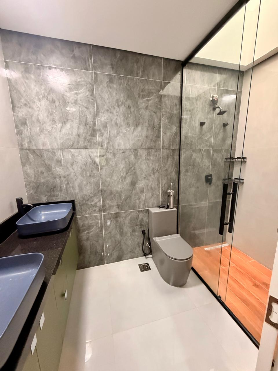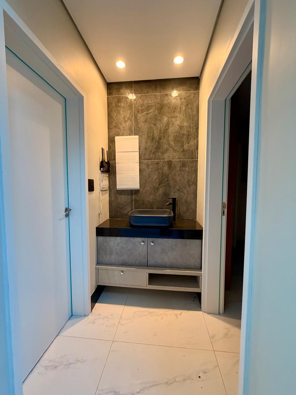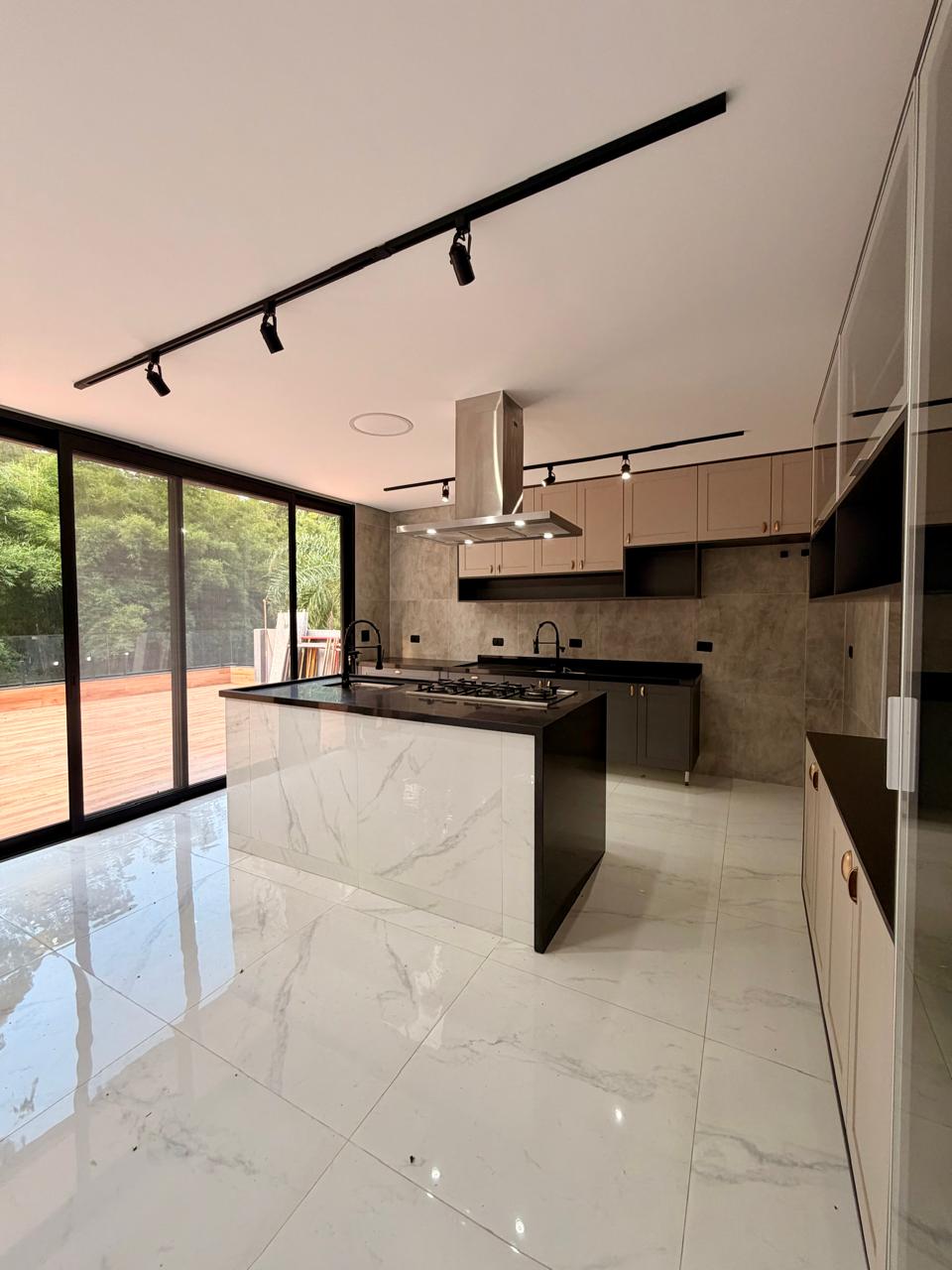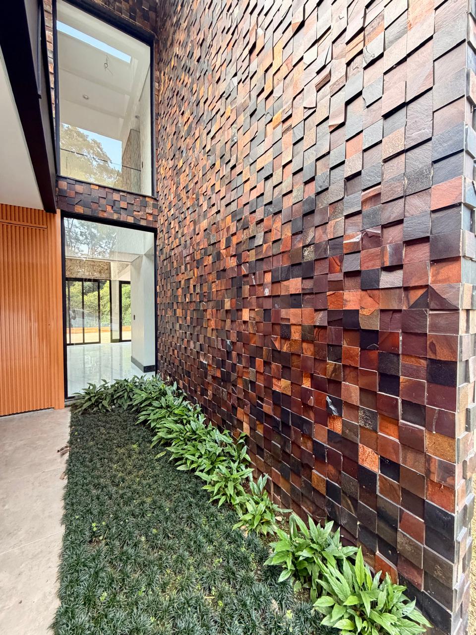 A arquitetura prioriza o conforto térmico e a iluminação, com três suítes avarandadas que convidam ao descanso. A versatilidade é um pilar deste projeto, contando com um escritório no térreo que pode facilmente ser transformado em suíte de hóspedes, atendendo a diferentes configurações familiares. A cozinha, ponto central da casa, já conta com marcenaria sob medida e cooktop instalado, integrada à despensa e área social.