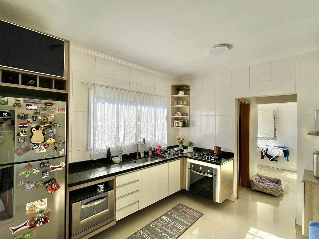 • Cozinha planejada com despensa, armários, balcão e pia em inox