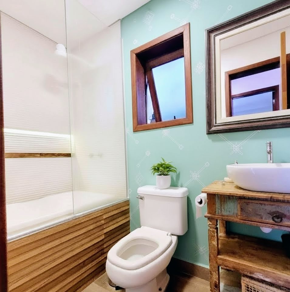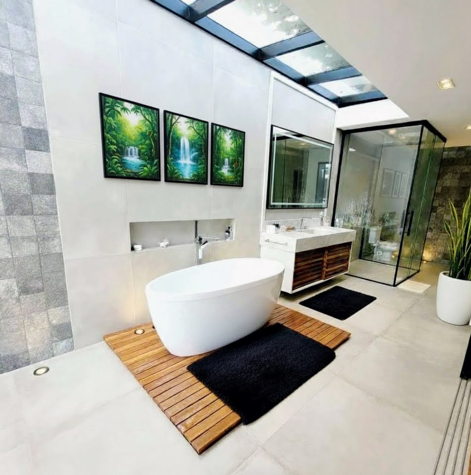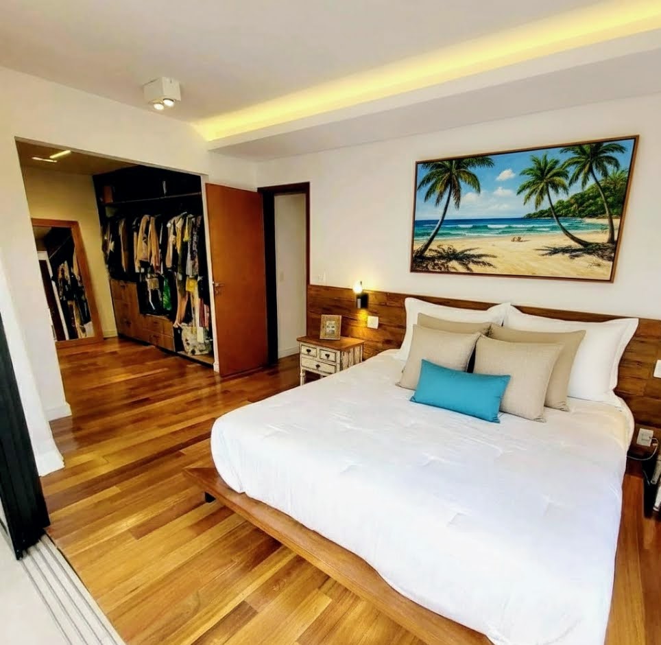 O setor íntimo reserva uma experiência de hotelaria de luxo. A suíte master foi concebida como um santuário de relaxamento, apresentando um banheiro monumental de 20 m² com banheira de imersão estrategicamente posicionada sob uma claraboia, permitindo banhos relaxantes sob o céu. Os acabamentos em piso de madeira e o closet espaçoso reforçam o padrão construtivo superior.