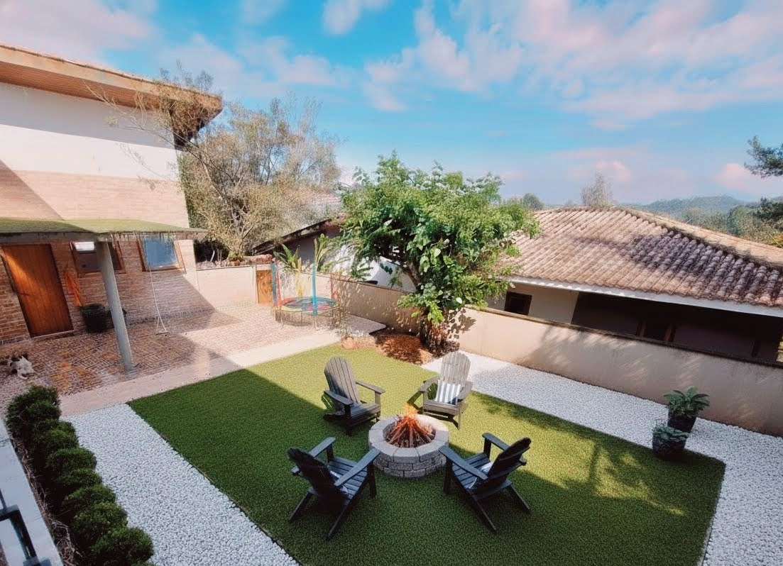 Para o lazer, a residência oferece um espaço gourmet completo e coberto, com churrasqueira e detalhes em ladrilho hidráulico, ideal para celebrações em família. O terreno de 450 m² abriga um quintal com horta orgânica e árvores frutíferas, promovendo um estilo de vida sustentável e saudável para crianças e pets.