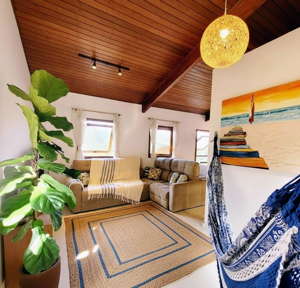 A planta de 168 m² foi projetada para maximizar a entrada de luz natural e a fluidez entre os ambientes. O living em open concept, com pé-direito valorizado pelo forro de madeira e janelas generosas, cria uma atmosfera acolhedora e sofisticada. A cozinha, planejada com design contemporâneo, integra-se perfeitamente ao espaço de convivência, tornando o ato de cozinhar um evento social.