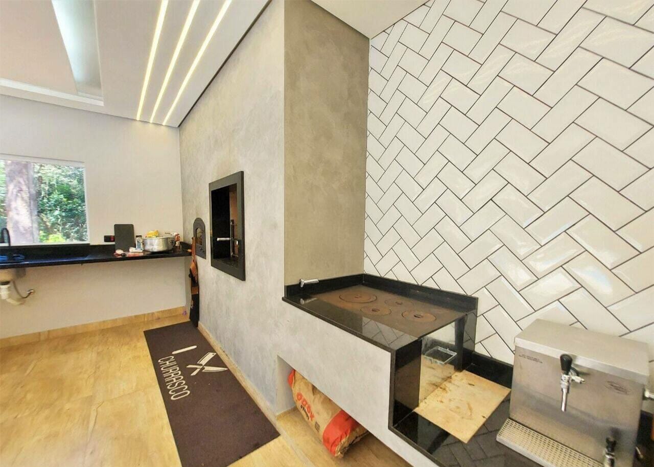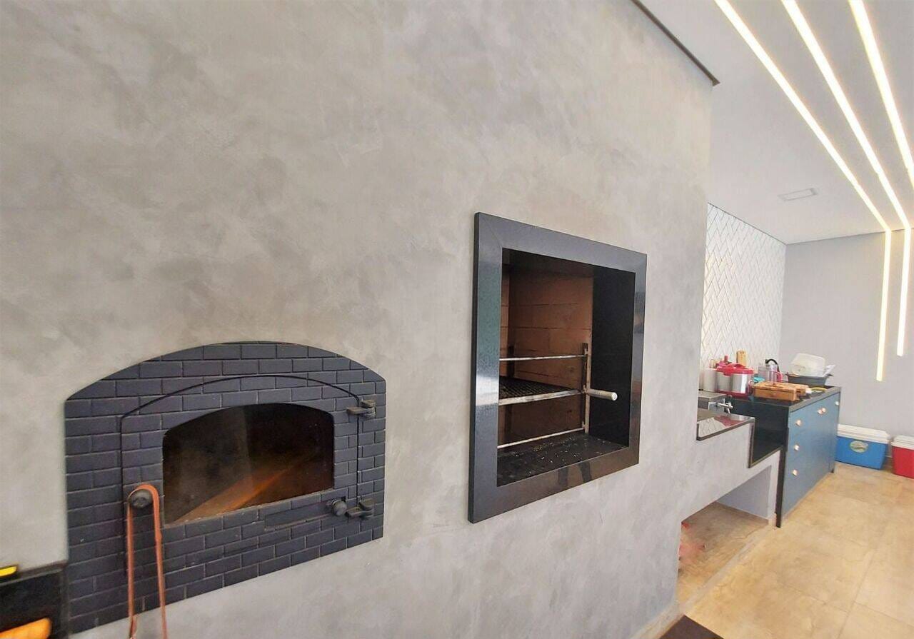 Espaço gourmet sofisticado com churrasqueira, forno de pizza, fogão à lenha e bancada em granito negro
