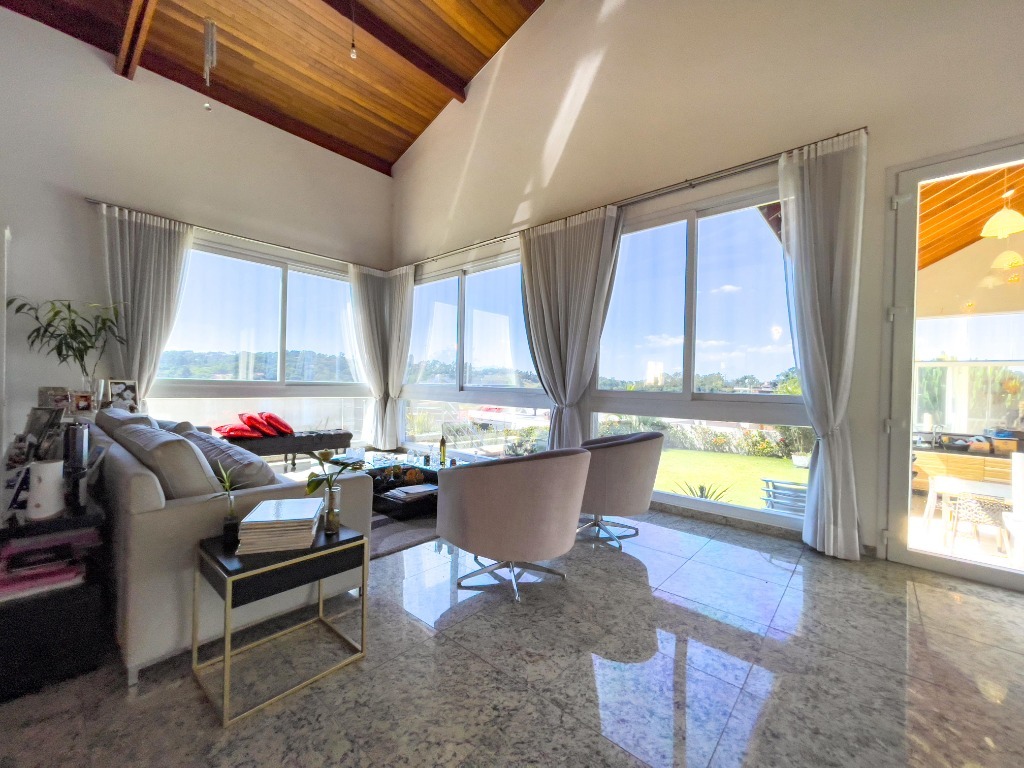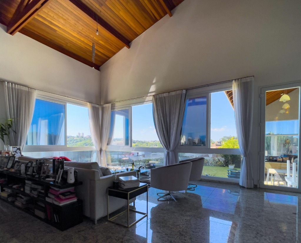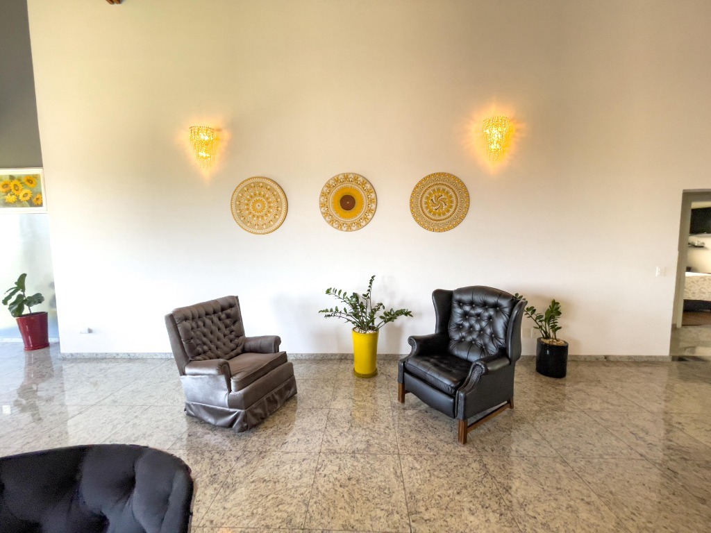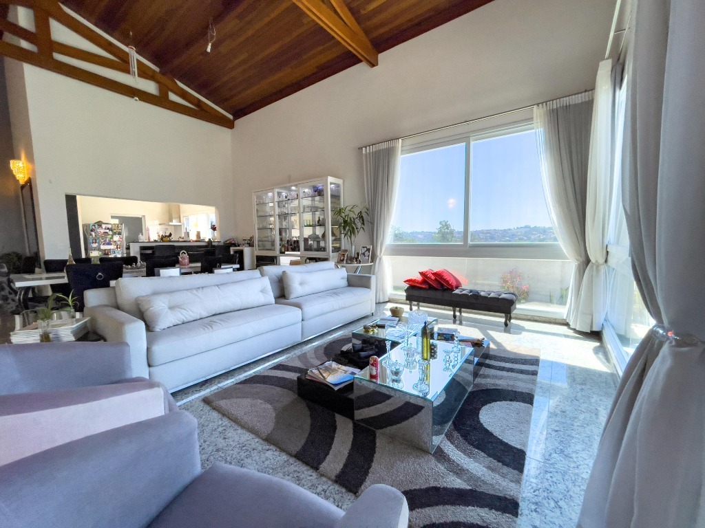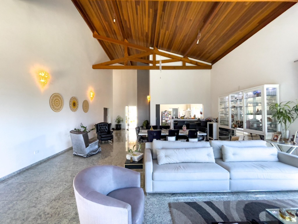 Sala ampla com 3 ambientes, acabamento em piso de granito, além de sala de TV climatizada.