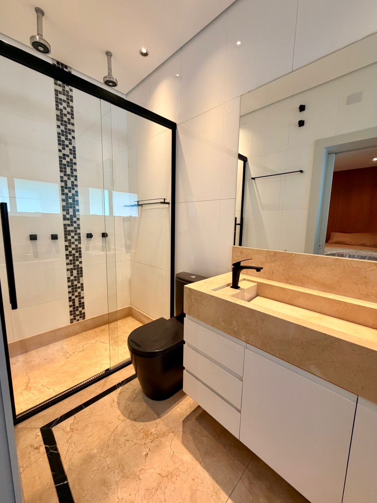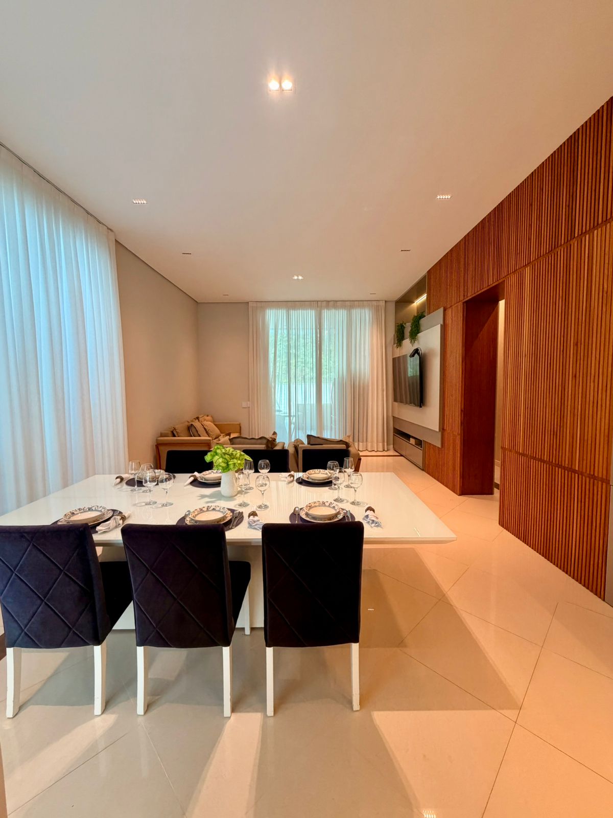 A planta privilegia a fluidez dos espaços. Na área social, o pé-direito generoso e as grandes aberturas de vidro garantem iluminação natural abundante. A sala de cinema dedicada e o living com lareira oferecem o aconchego necessário para os dias de descanso, enquanto a área gourmet com piscina privativa se torna o centro das atenções para recepções sociais. No setor íntimo, as três suítes mantêm a privacidade e o conforto térmico, com destaque para a suíte principal equipada com sala de banho de alto luxo.