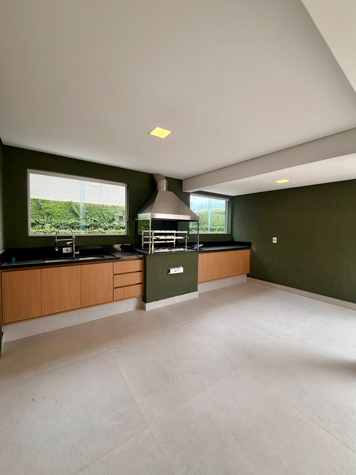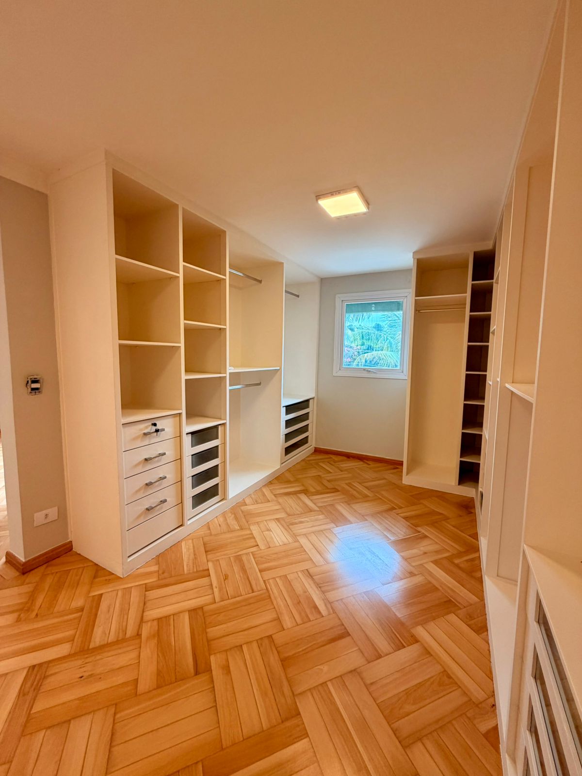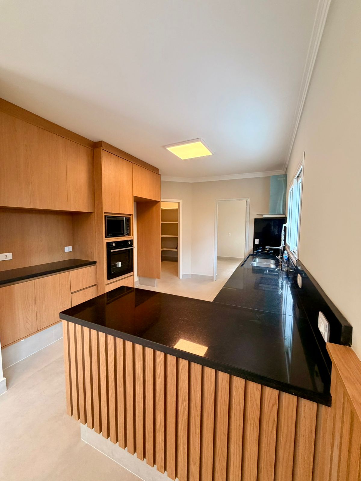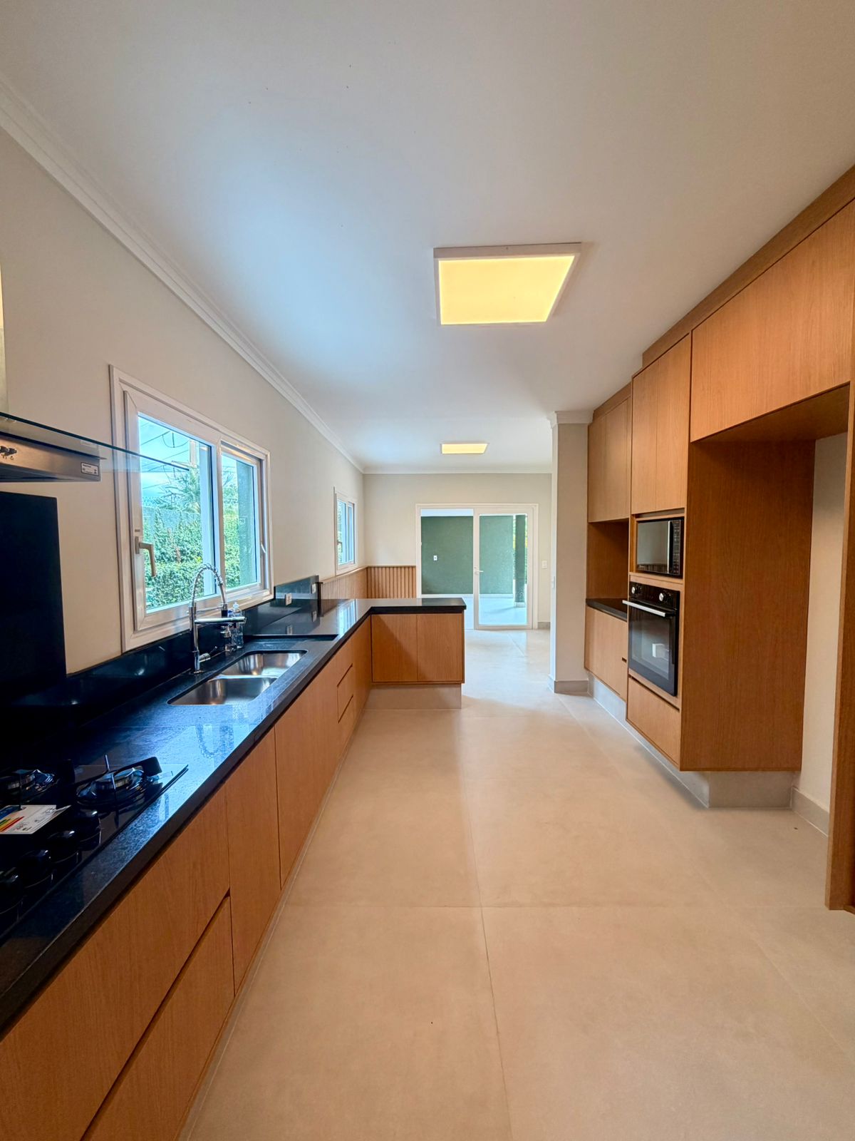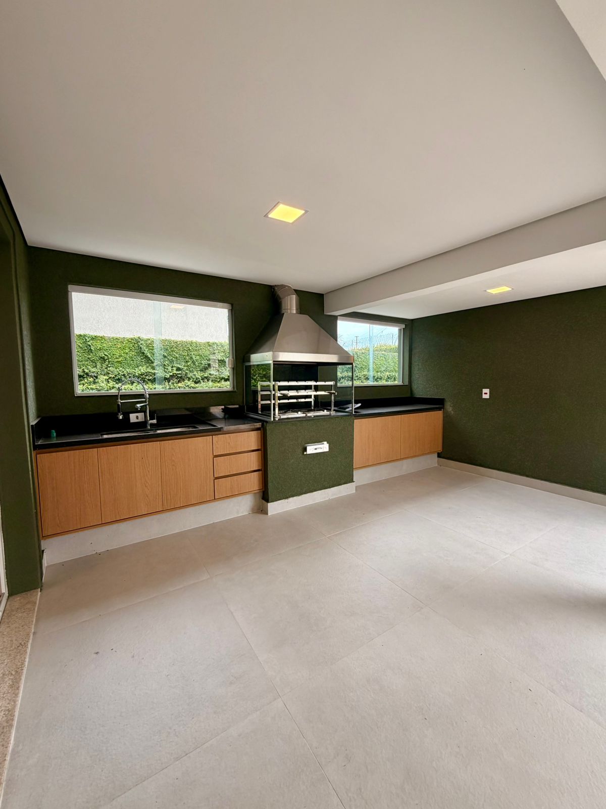 O grande diferencial deste projeto é a disposição das suítes. Com três delas localizadas no andar inferior, o imóvel torna-se extremamente acessível e confortável. No andar superior, a versatilidade impera: uma sala adicional e um ambiente de estudos/ateliê oferecem o refúgio necessário para hobbies ou foco profissional. A cozinha é um capítulo à parte, entregue totalmente equipada com eletrodomésticos embutidos e marcenaria sob medida de primeira linha.