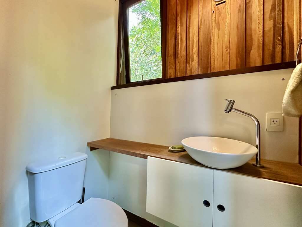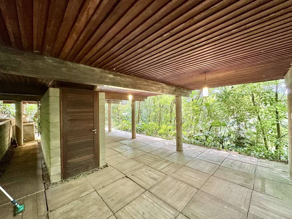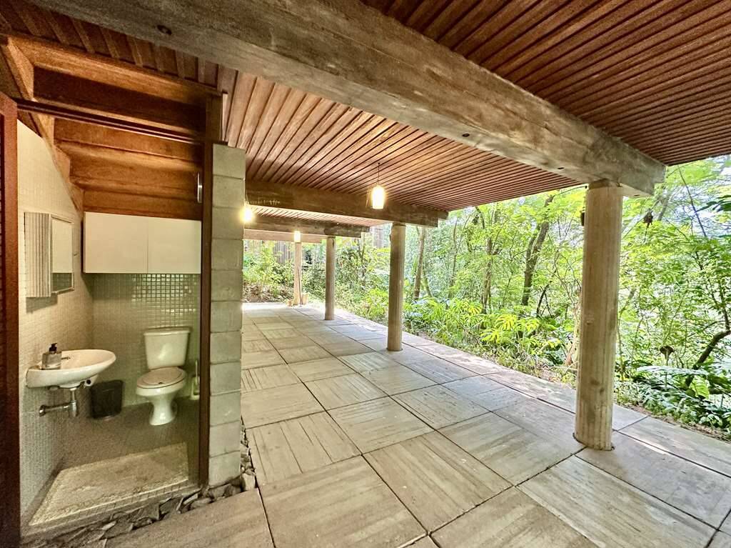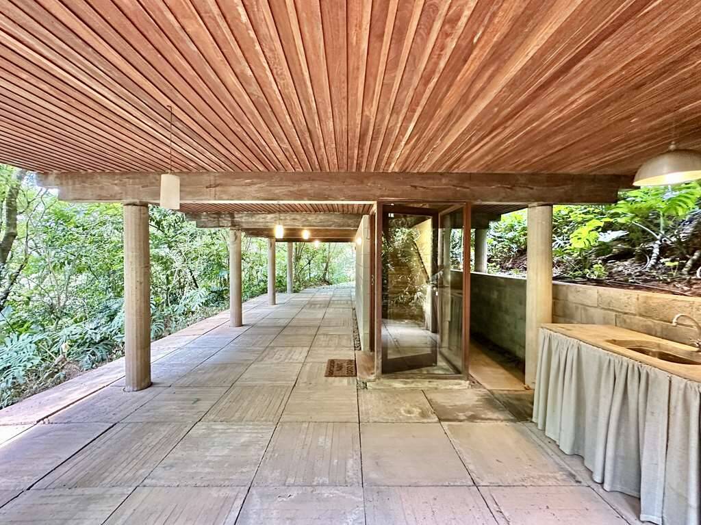 - Garagem integrada à natureza, com bancada de concreto, pia inox, ganchos para 2 redes, lavabo e acesso por escada interna.