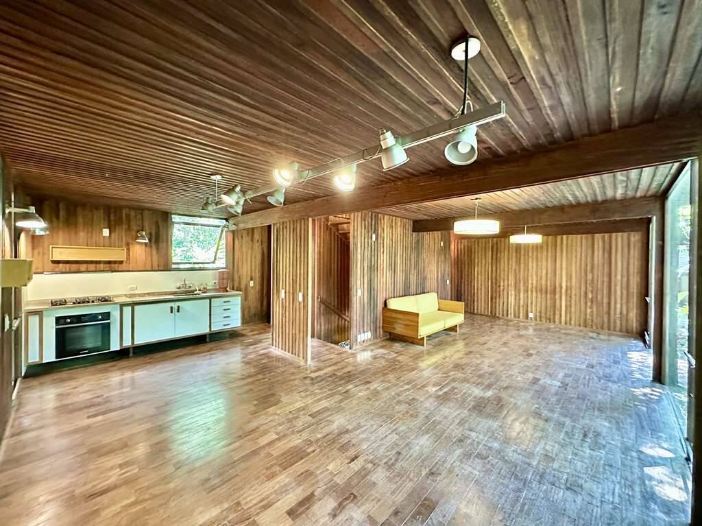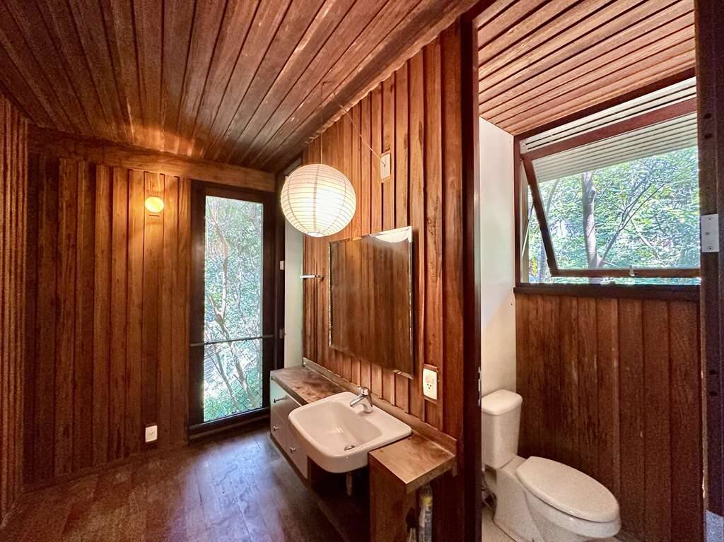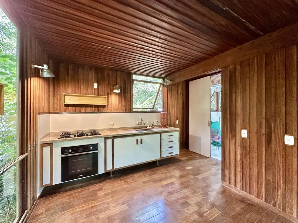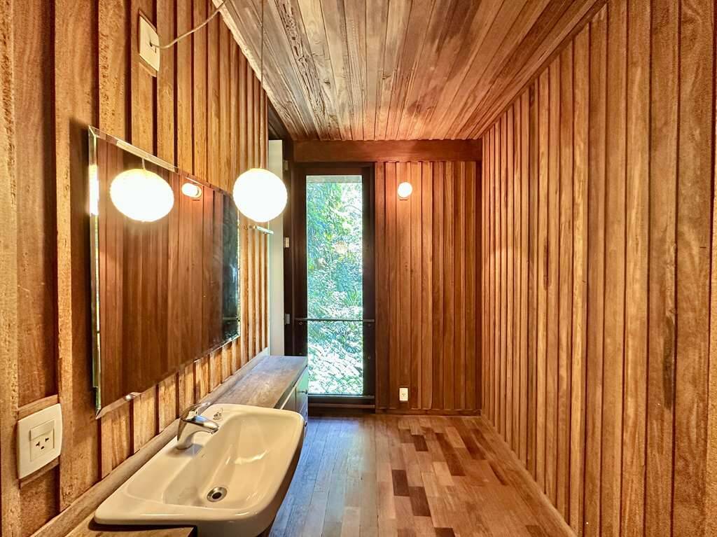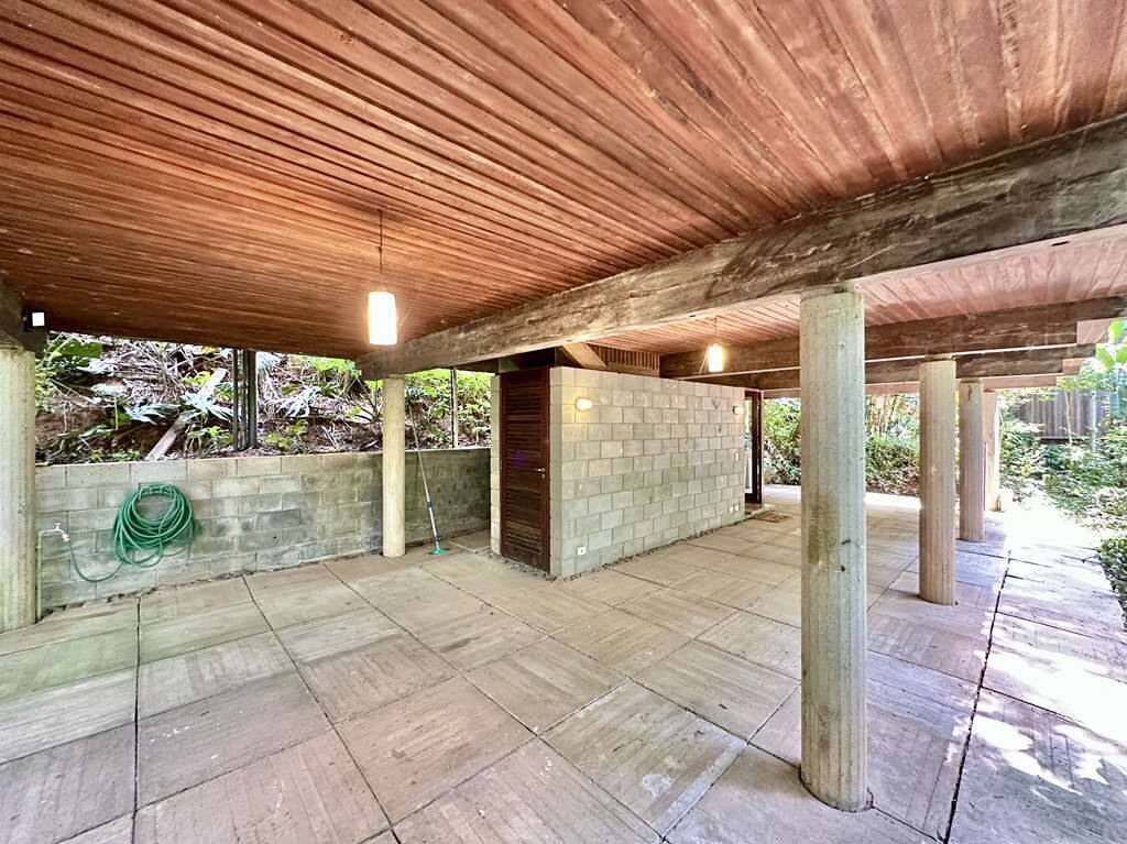 - Garagem integrada à natureza, com bancada de concreto, pia inox, ganchos para 2 redes, lavabo e acesso por escada interna.