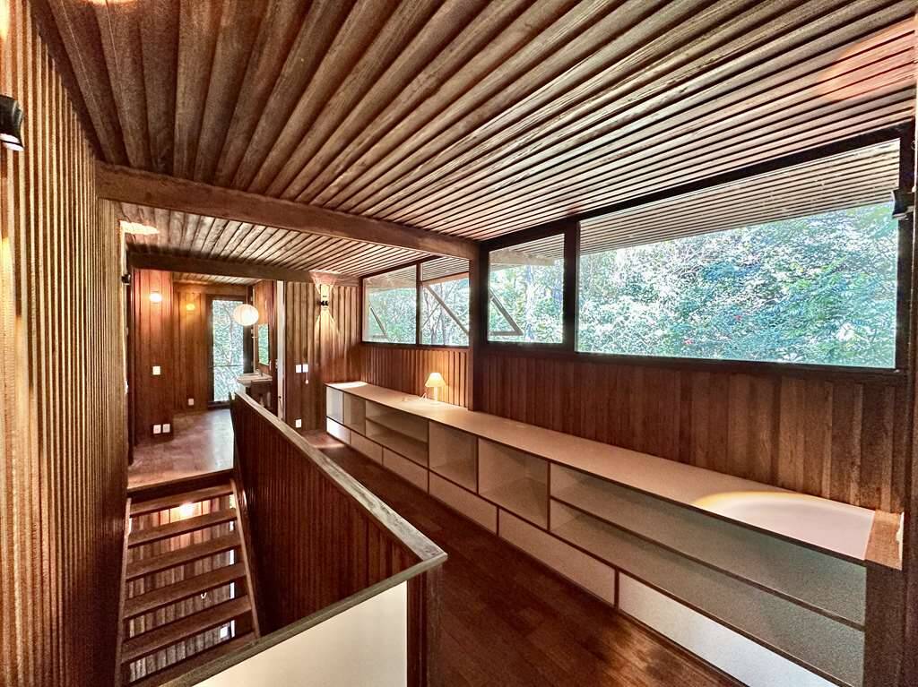 - Hall íntimo envidraçado e bem iluminado naturalmente no piso superior, com bancadas e nichos para biblioteca, escritório e estudos.
