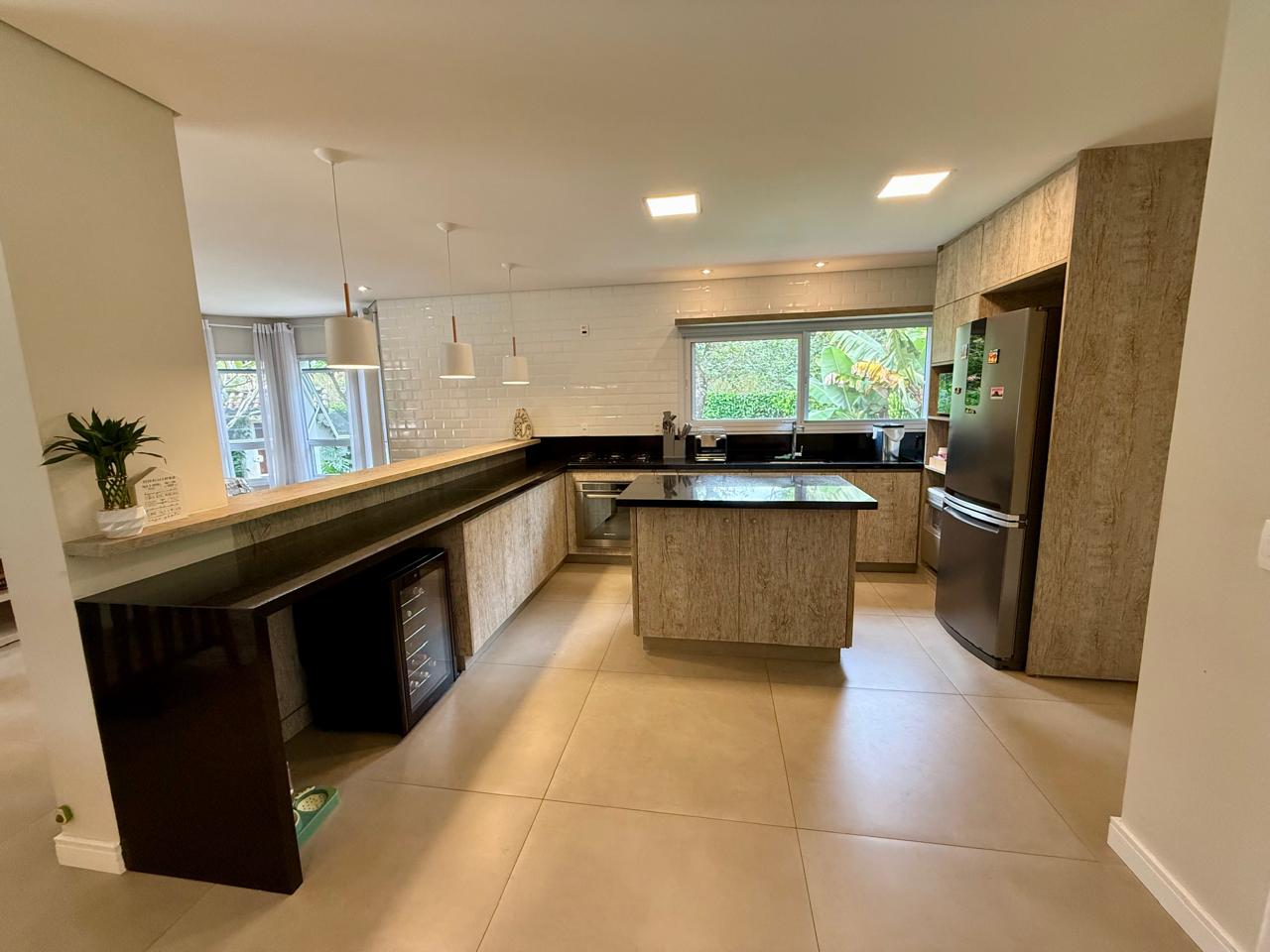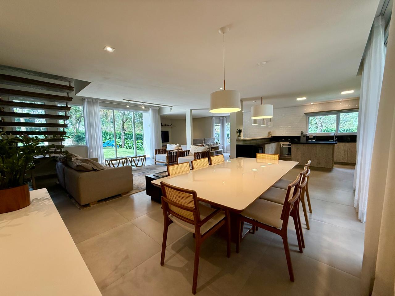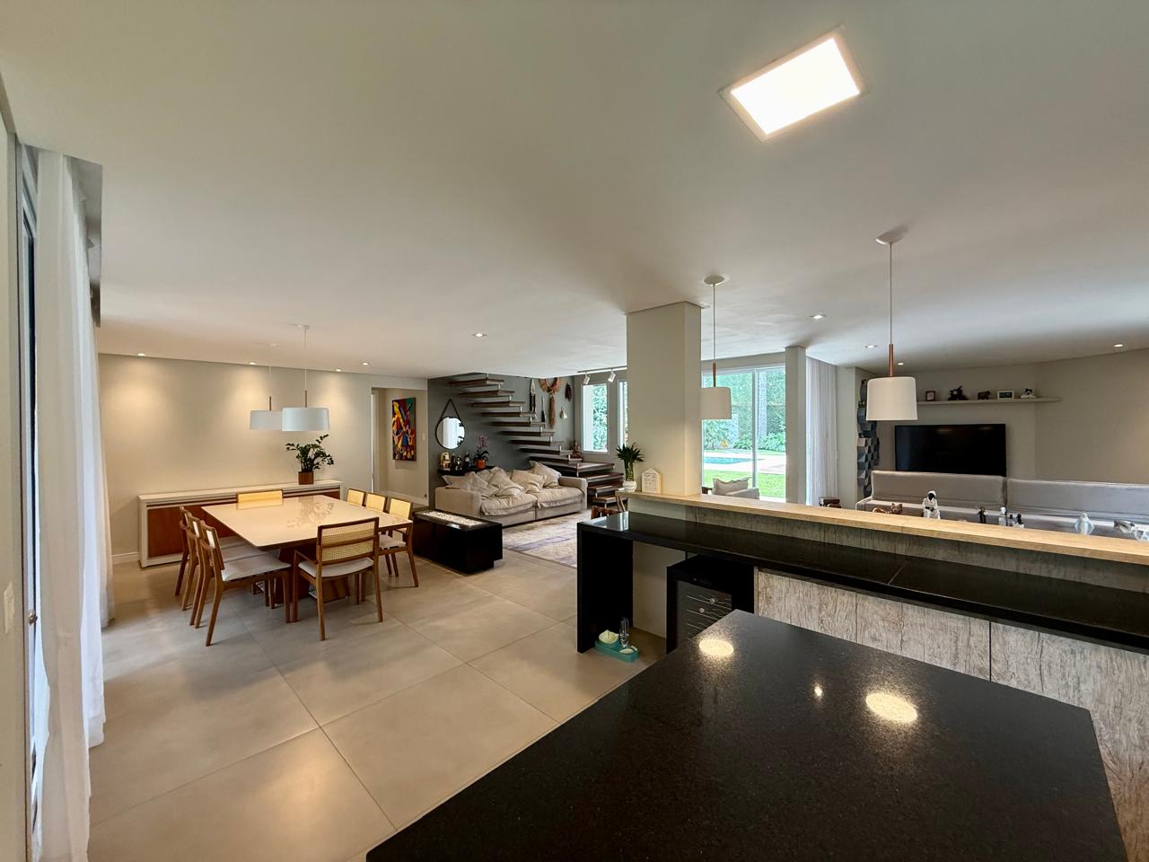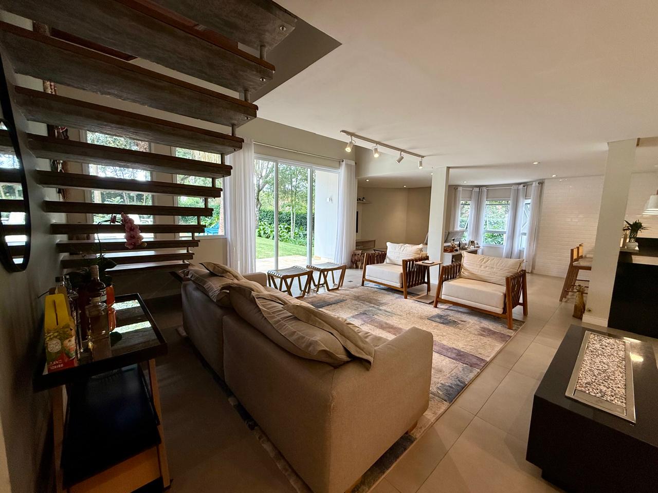 O imóvel está implantado em um terreno amplo de 1.175 m², com 335,70 m² de área construída, e apresenta um projeto que valoriza conforto, integração dos ambientes e contato com a natureza. São 3 suítes espaçosas, além de áreas sociais acolhedoras, com destaque para as lareiras internas e a elegante lareira de chão, que trazem charme e aconchego aos ambientes.