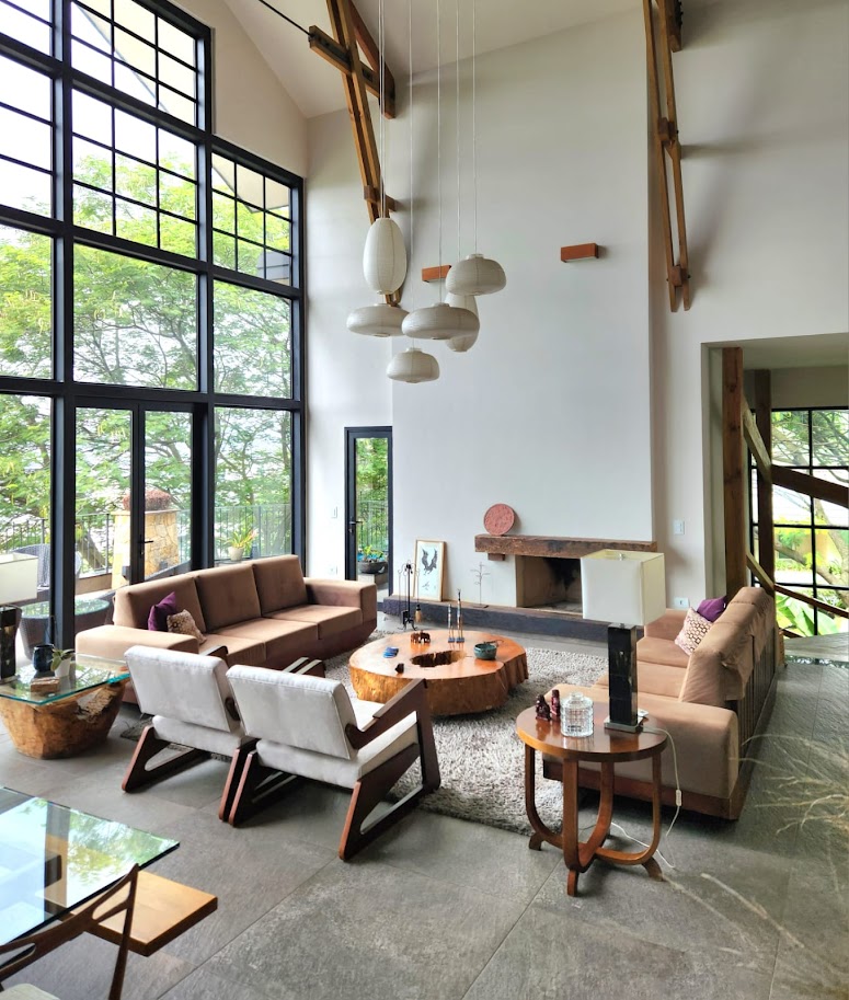 Amplo living com salas de estar e jantar com duas lareiras e pé-direito de 6 a 8,5 metros, com tesouras em madeira e aço, proporcionando sensação de amplitude e sofisticação.