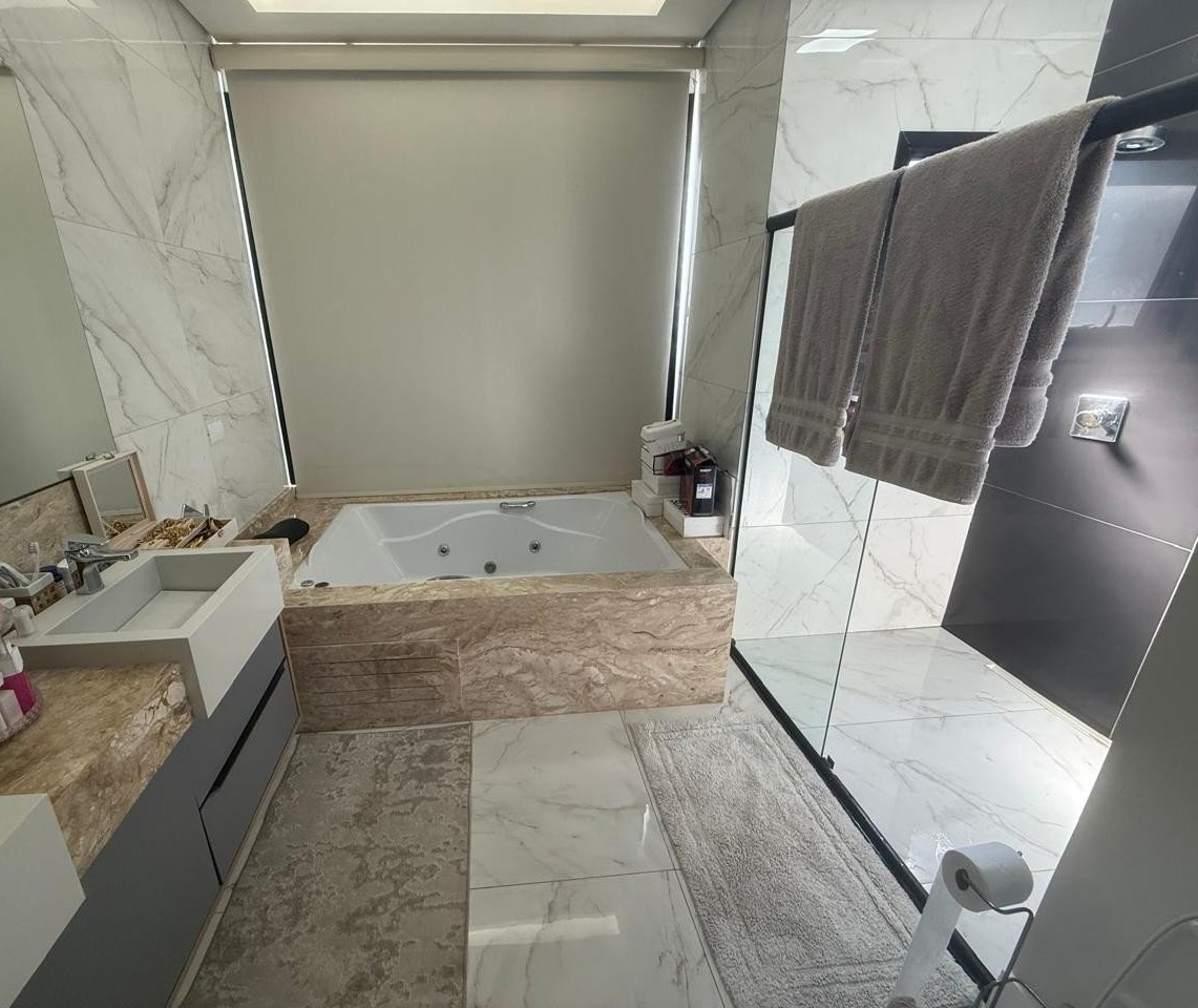 O imóvel conta com 4 suítes amplas, todas com acabamento em madeira nobre, e um SPA privativo com hidromassagem, ideal para relaxar após um longo dia. As áreas sociais são espaçosas e harmoniosas, com salas de estar e jantar decoradas com materiais de alto padrão, como mármore e porcelanato, criando um ambiente sofisticado e acolhedor.